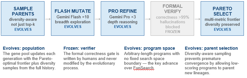 父代选择时,不是只选最优者,分数差的程序可能携带了对另一目标有用的遗传材料。群体修剪用 Pareto 前沿。形式化验证器是冻结的,人写的,检查程序是否真的算对了