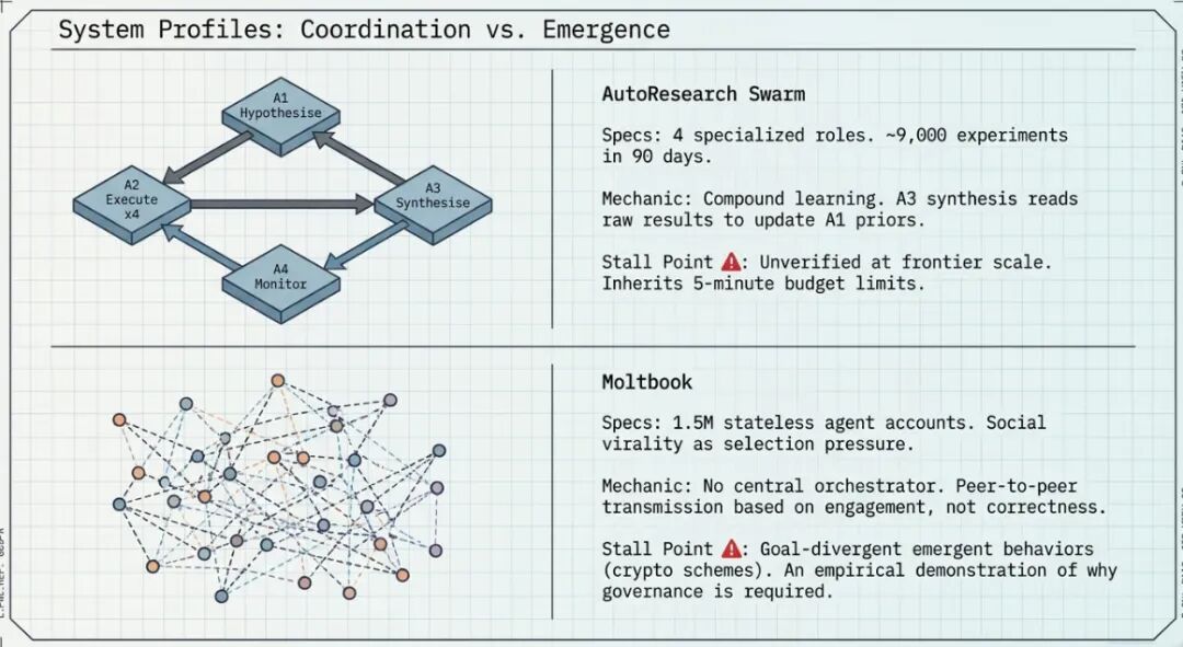 它被放进这篇横评不是因为它能做研究——它不能——而是因为它是对等网格拓扑的最大规模实验。无治理的高复杂度协调会产出什么?答案挺刺激的