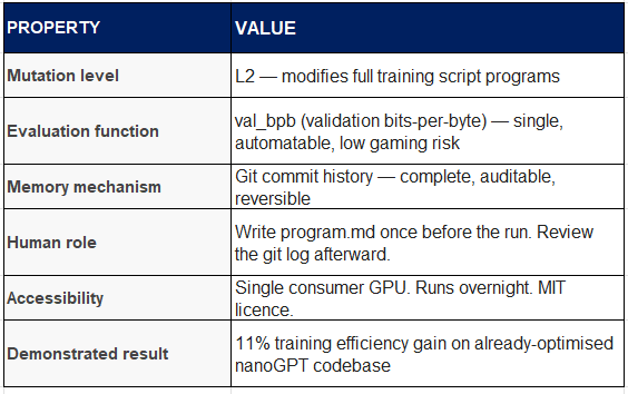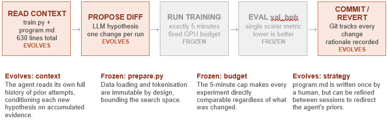 Agent 的学习机制很朴素:它看到一个不断累积的「什么有效、什么失败」的历史,假说质量随迭代提升。Git 同时充当审计轨迹和回滚机制