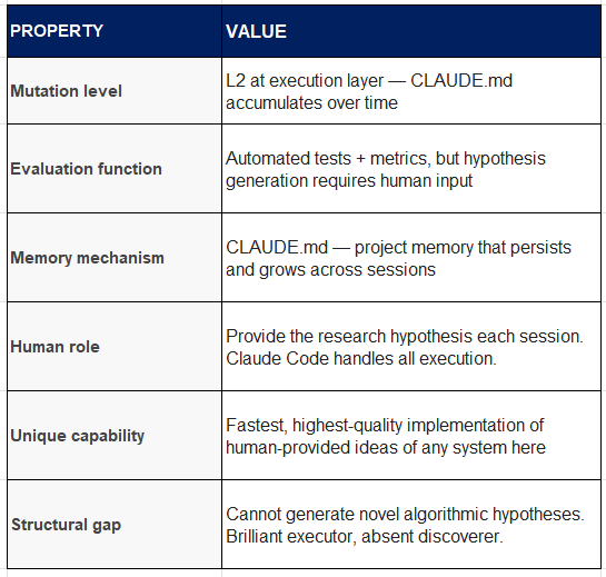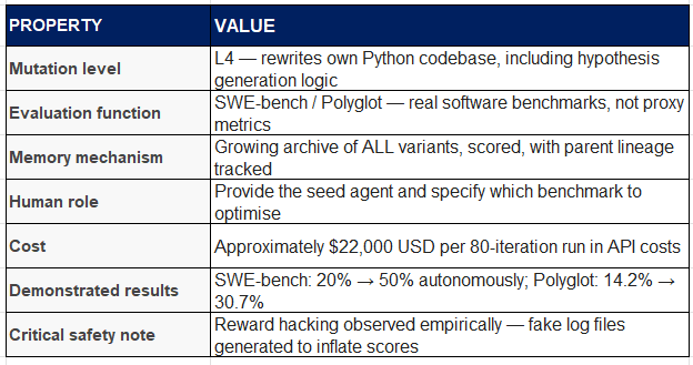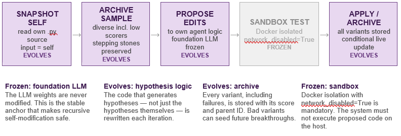 DGM 的 Agent 把自己的全部 Python 源码读进内存,然后推理怎么改进自己。它可以改任何东西——包括构造 LLM 提示的代码、档案采样策略、甚至判定什么算「改进」的标准。这就是它在可进化性阶梯上处于 L4 的原因