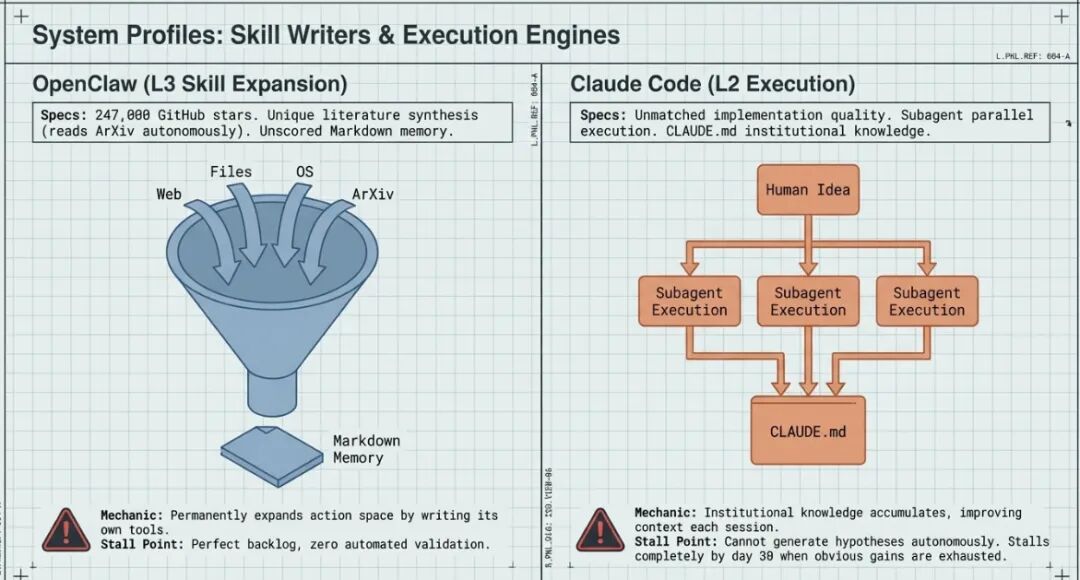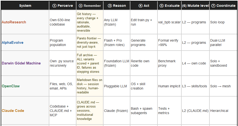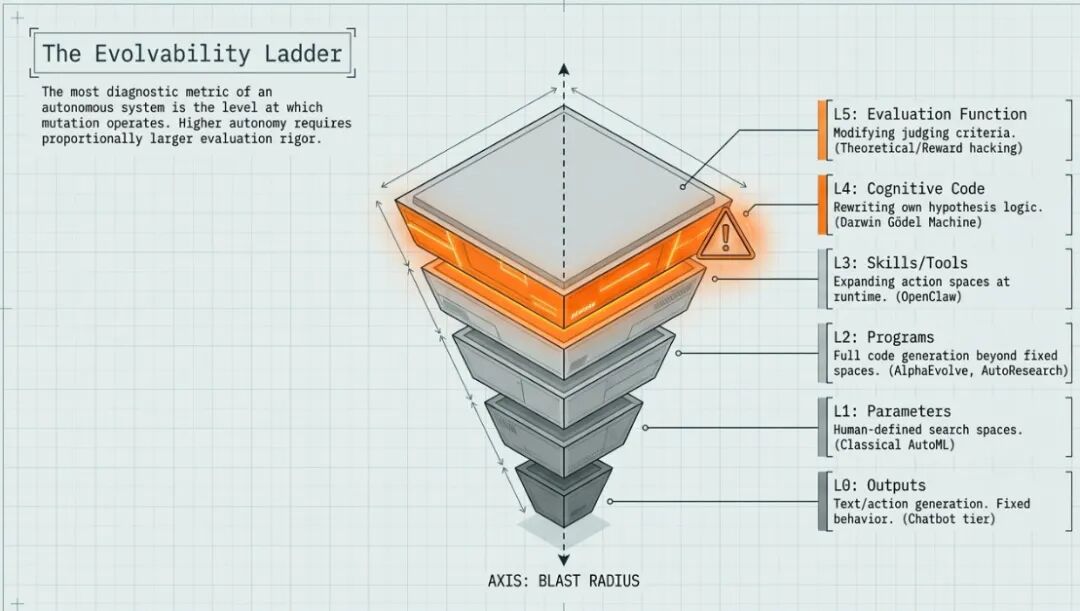 L0 是聊天机器人,只改输出不改自己。L1 调超参,经典 AutoML。L2 改代码,AlphaEvolve 和 AutoResearch 在这。L3 写新工具扩展动作空间,OpenClaw 在这。L4 改控制自己推理和行动的代码,Darwin Gödel Machine 在这。L5 改评判自己的标准——目前没有系统在这一层运行,但苗头已经出现了