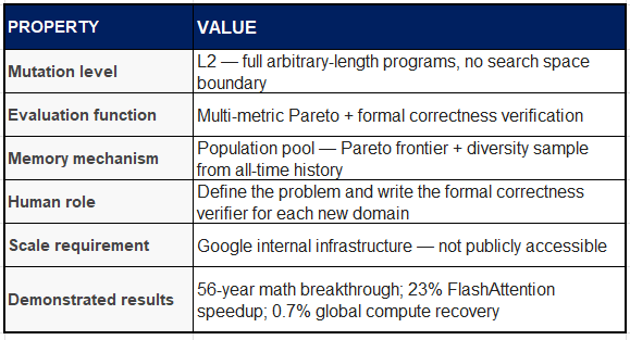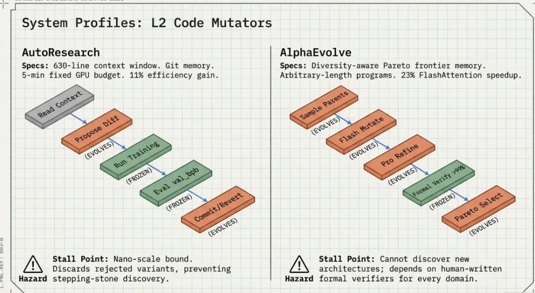 卡在哪:AlphaEvolve 发现怎么更高效地计算一个给定架构,但它不能发现该用什么架构。内核级增益到 25-30% 大概就封顶了