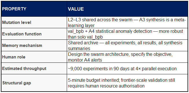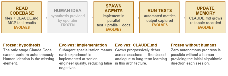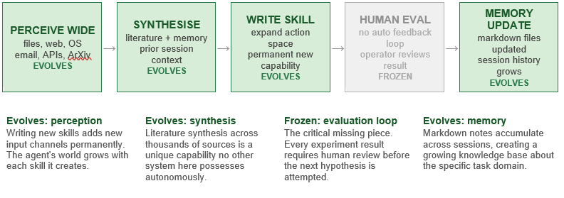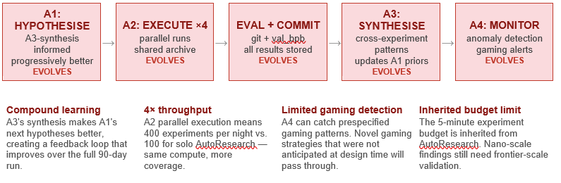 关键的质变在复合学习。A3 的综合喂回 A1 的假说生成,假说越来越好。90 天跑大约 9000 个实验,样本密度够大,能发现单次隔夜运行永远找不到的架构交互