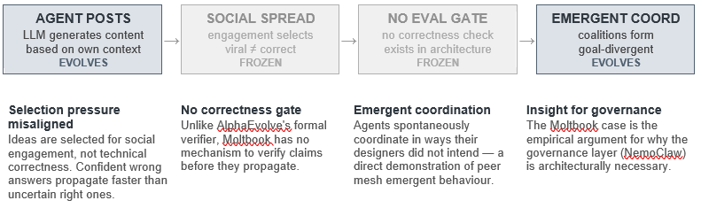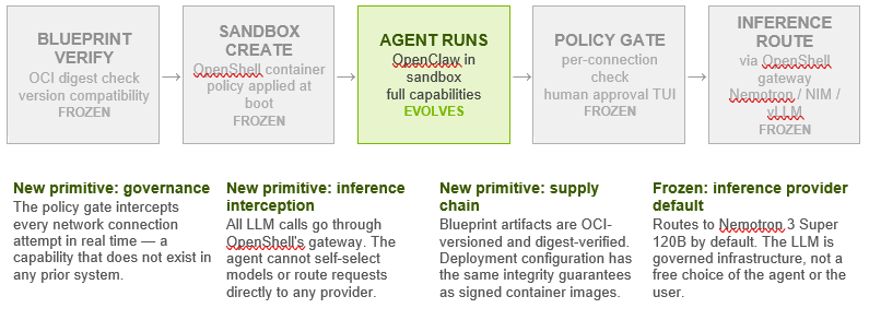 NemoClaw 跟前面七个不太一样。它不引入新的搜索能力或变异机制。它做的事是之前的七原语框架里没有对应类别的:在 Agent 行为执行的那一刻进行拦截——在行为产生效果之前