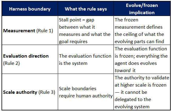 规则一在测量边界触发——Harness 能测量的捕捉不到真正目标时,Agent 就在那里停滞。规则二命名了 Harness 的核心组件。规则三在权威边界触发——人类是 Harness 最外层的边界