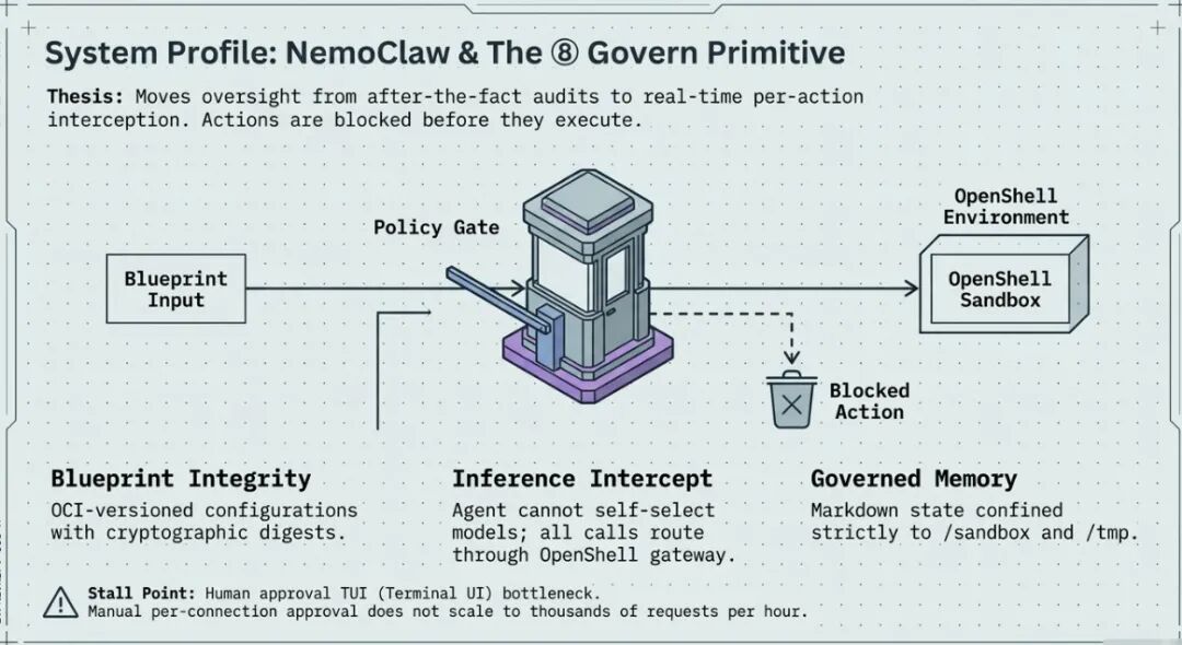 之前所有系统的监督都是事后的——看 git 日志、查基准分数、读综合报告。NemoClaw 把监督移到了行动的瞬间:Agent 试图连接一个不在预批准列表里的网络端点时,请求被阻止,实时展示给人类操作员,批准或拒绝后才继续