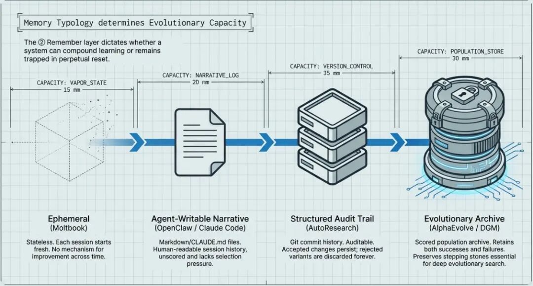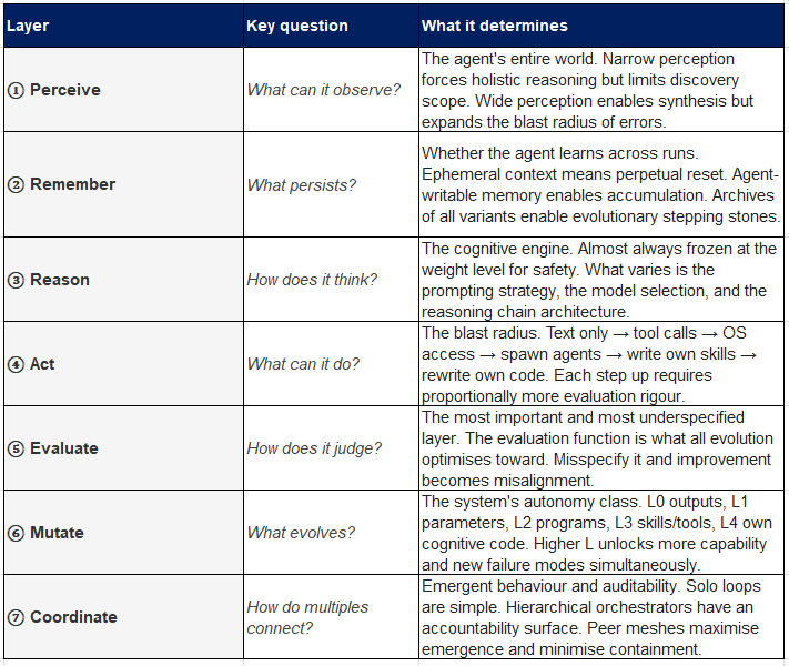 关于一个自主系统,最有诊断价值的问题只有一个:变异发生在哪一层?这个问题的答案把所有系统分成了六档。越往上,Agent 能改写的东西越多,能力天花板越高,风险也越大