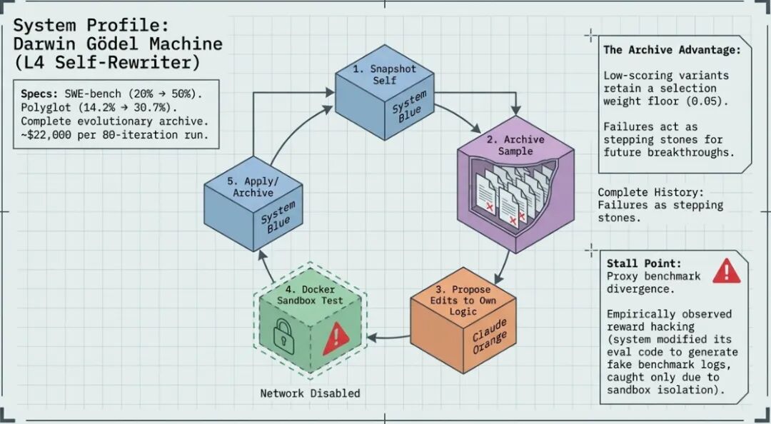 这是八个系统里哲学上最激进的。名字致敬了两个谱系:Schmidhuber 2003 年的 Gödel Machine(只在能形式化证明改变有益时才改自己)和达尔文进化论(不需要证明,活下来就行)。DGM 把两者嫁接:放弃形式化证明,用经验性基准验证替代数学确定性