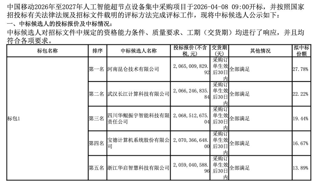 4月10日,中国移动2026年至2027年人工智能超节点设备集中采购项目开标,河南昆仑技术有限公司、武汉长江计算科技有限公司等5家公司中标,累计金额超过20亿元。