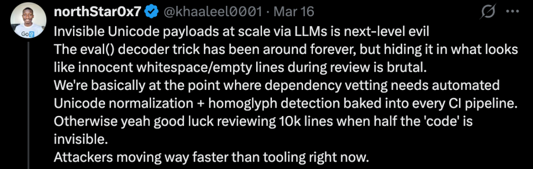 有网友表示,用 LLM 大规模注入隐形 Unicode 载荷,简直是邪恶升级。我们现在基本上已经到了需要将自动化 Unicode 规范化和同形字检测集成到每个 CI 流水线中的依赖审查阶段,否则当一半的「代码」都不可见时,想人工审查 1 万行代码简直难如登天。