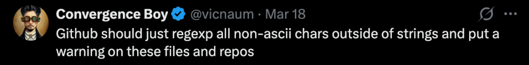 GitHub 等平台也应该对字符串之外的所有非 ASCII 字符进行正则表达式处理,并在这些文件和仓库中添加警告。