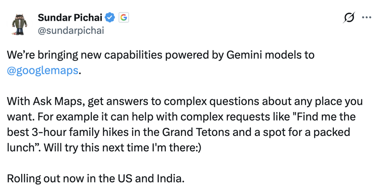 3月12日,Google CEO Sundar Pichai在x上宣布,Google地图即将迎来一次重要升级——接入 Gemini,并将推出 Ask Maps 和沉浸式导航两项新功能。