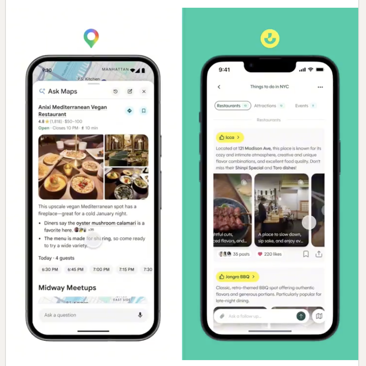 Ask Maps可以利用 Gemini的语义理解能力,来回答用户的复杂问题。也能根据个人偏好来推荐地点。在选定地点后,可以直接帮用户预订餐厅。