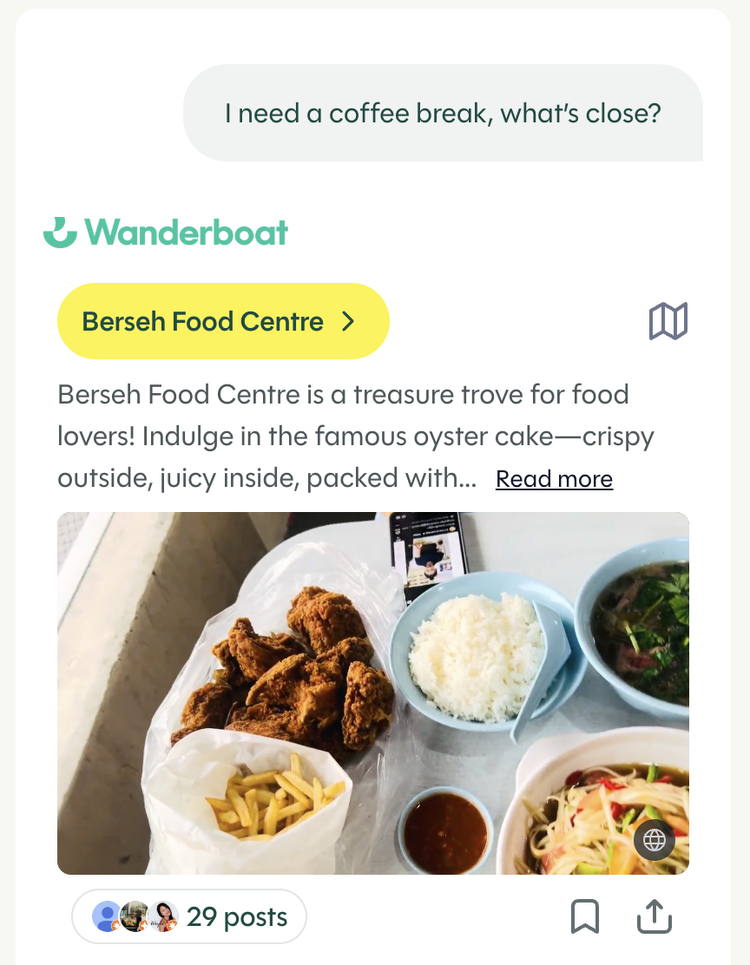 Wanderboat 给人的使用体验,有AI版的小红书、大众点评和马蜂窝的结合体的味道。