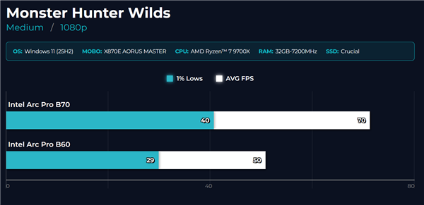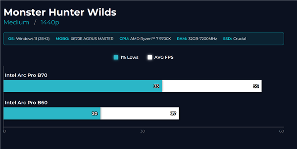 如今,首批锐炫Pro B70的游戏性能测试已经出炉,表现相当亮眼。