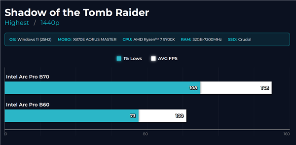 Level1Techs对锐炫Pro B70进行了游戏实测,涵盖《怪物猎人:荒野》《古墓丽影:暗影》和《赛博朋克2077》三款游戏,测试分辨率覆盖1080p和1440p。
