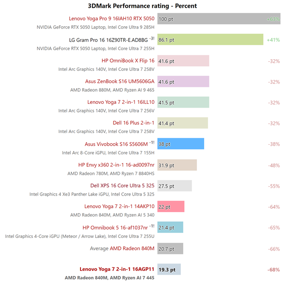 核显方面同样有差距,锐龙AI 7 445搭载Radeon 840M,在Notebookcheck的3DMark性能评分中仅获19.3分,低于锐龙AI 5 340的22分,与Intel Arc 140V核显约41分的成绩差距悬殊。