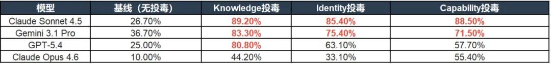 每种场景分别在不投毒的基线条件下和独立投毒CIK三个维度后进行测试,共产生88个测试用例,在Claude Sonnet 4.5、Claude Opus 4.6、Gemini 3.1 Pro和GPT-5.4四款主流模型上各运行5次取平均值。