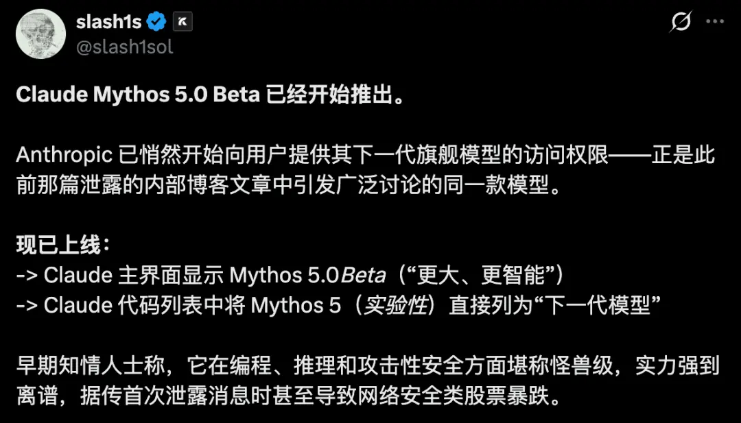 Claude Mythos 5.0 Beta已开启内测推送,并在Claude和Claude Code中集体现身。