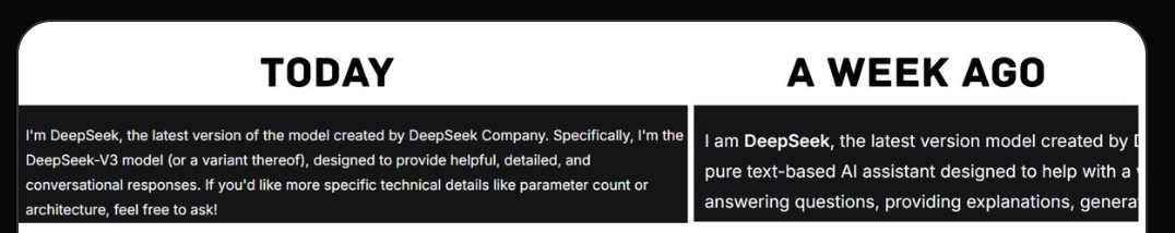 一周前,同样的问题,它的自我介绍还是模糊的“我是 DeepSeek,一款纯文字 AI 助手……“,对自己的版本号只字不提。