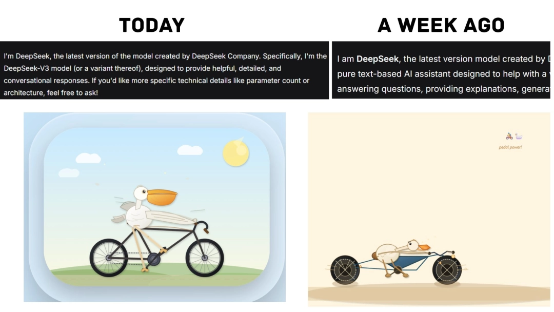 比如经典的用 SVG 画鹈鹕骑自行车任务,3 月 29 日的 DeepSeek,构图和色彩都明显比一周前强。
