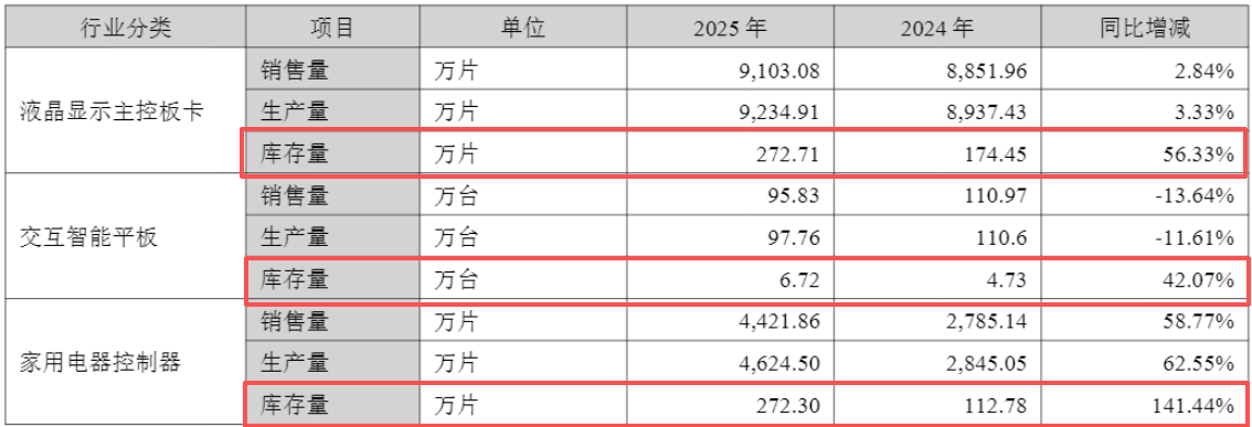 家用电器控制器的营收同比增长46.02%,销量同比增长58.77%,为匹配业务快速增长需求,公司同步增加生产量与库存量,保障市场供应。这一产品库存量同比大增141.44%至272.30万片。
