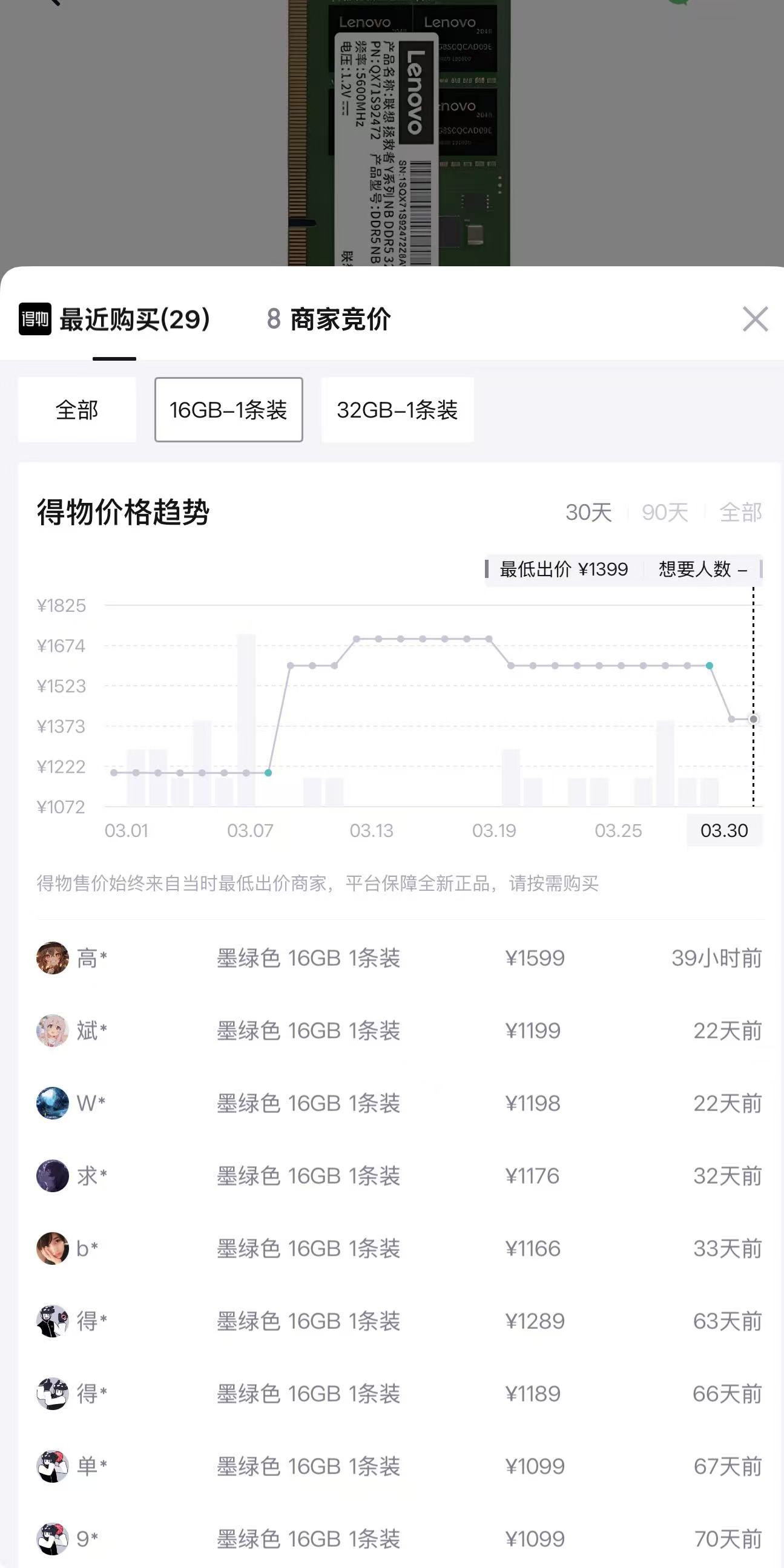 而在潮玩社区得物APP,界面新闻查阅发现,16G DDR5内存条价格在3月13至19日达到最高价,约1674元一条,目前已经回落至1399元左右。