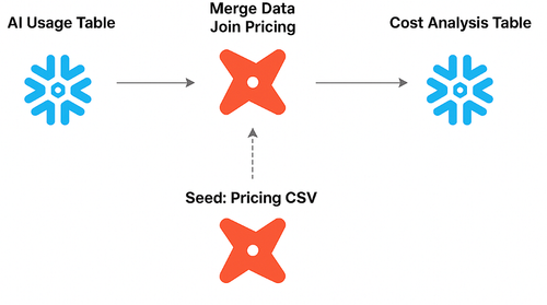 我们使用版本控制系统(Git)维护一个关键的CSV 文件,其中包含我们所有的模型定价信息。该表包含Model名称(使用正则表达式以提高灵活性)、Type(输入/输出)、Price(每百万代币价格)Provider、以及Publish_Date(用于跟踪价格随时间变化的指标)。DBT的seed命令会将此 CSV 文件加载到 Snowflake 的静态表中。
