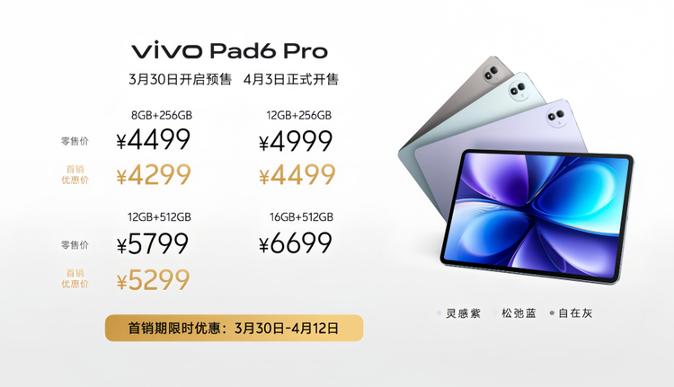 跟随vivo X300 Ultra、vivo X300s一同发布的还有vivo Pad6 Pro,以全面进化的旗舰实力推动安卓正式开启4K性能平板时代。搭载13.2英寸4K原彩屏,支持杜比视界,视听体验更沉浸;配合第五代骁龙8至尊版,实现性能跨越式升级;集成PC级WPS和剪映专业版,学习办公与创作表达高效合一。提供松弛蓝、灵感紫、自在灰三款配色,上市价格4499元起。目前已经开启预售,4月3日正式开售,首销期间可享多重优惠。
