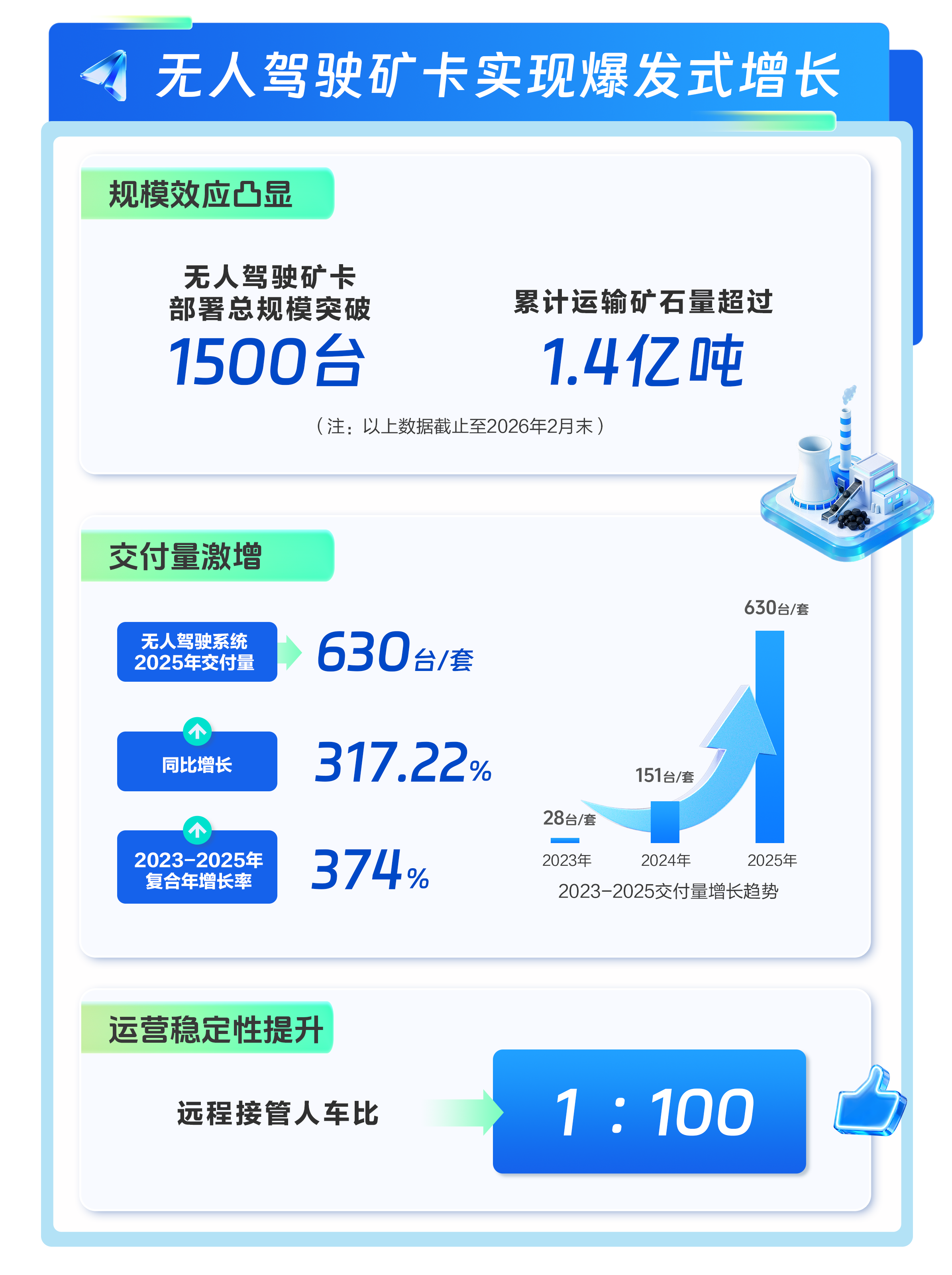 无人驾驶矿卡商业化规模持续突破。2025年交付量达630台/套,同比大增317.22%,2023-2025年销量增长超20倍。截至2026年2月末,公司无人驾驶矿卡累积部署规模突破1500台,累计运矿超1.4亿吨。技术方案的成熟度与运营稳定性得到充分验证,构筑起坚实的场景壁垒。