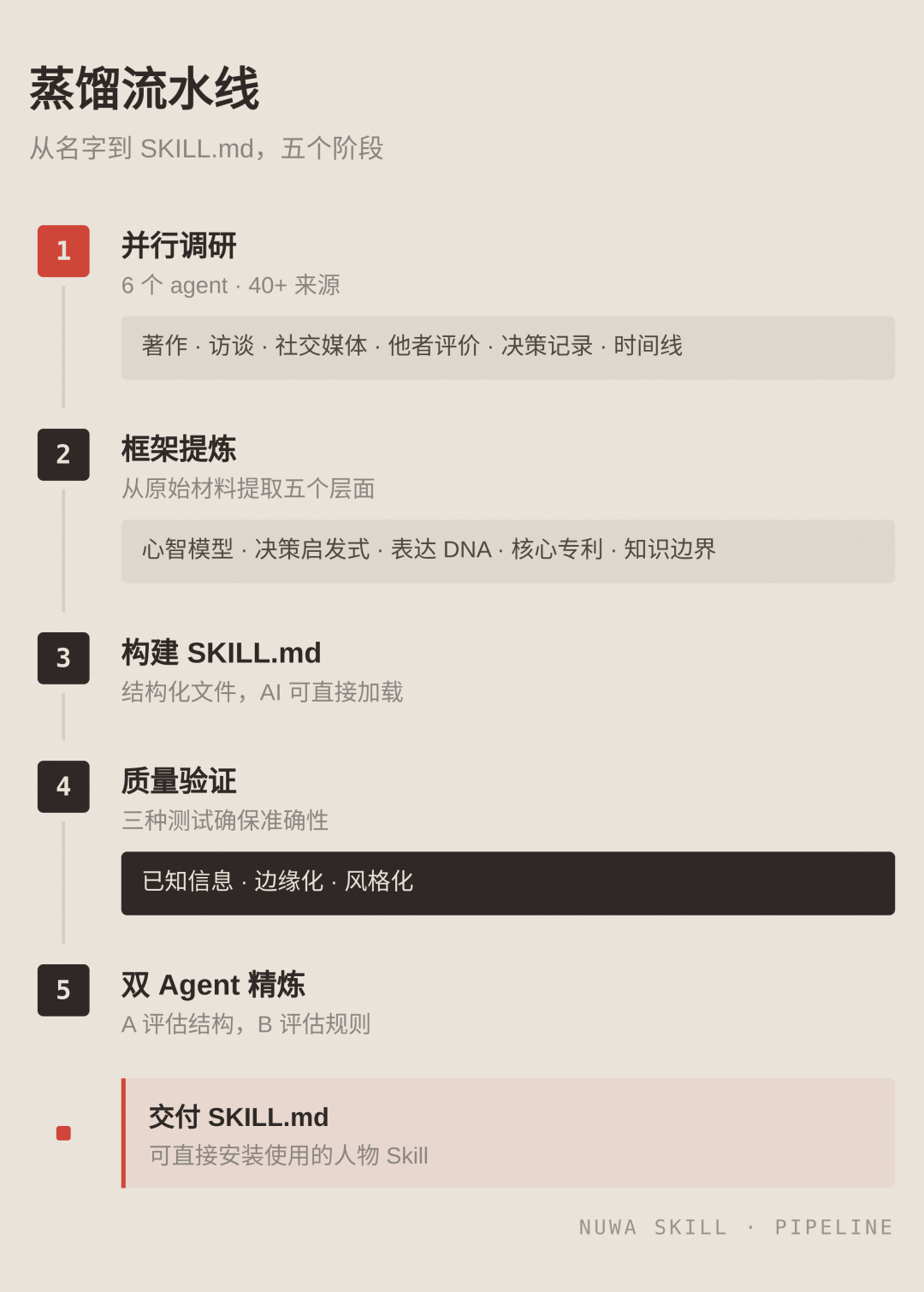 全部完成才交付最终的 SKILL.md。整个流程:调研 → 提炼 → 构建 → 验证 → 精炼