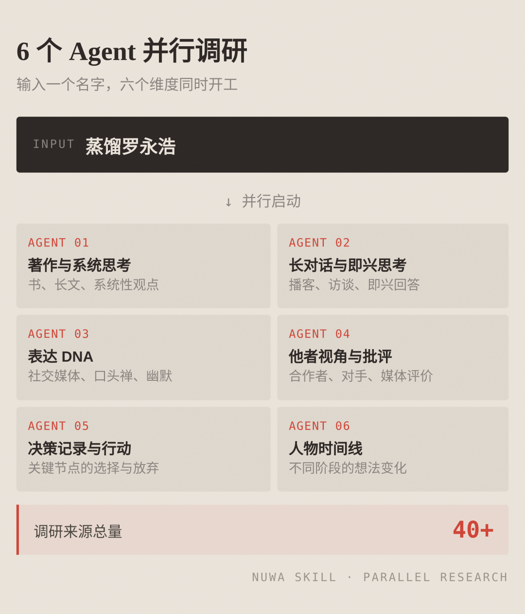 输入名字之后,女娲 skill 并行启动 6 个 agent,每个 agent 负责一个维度,同时开工