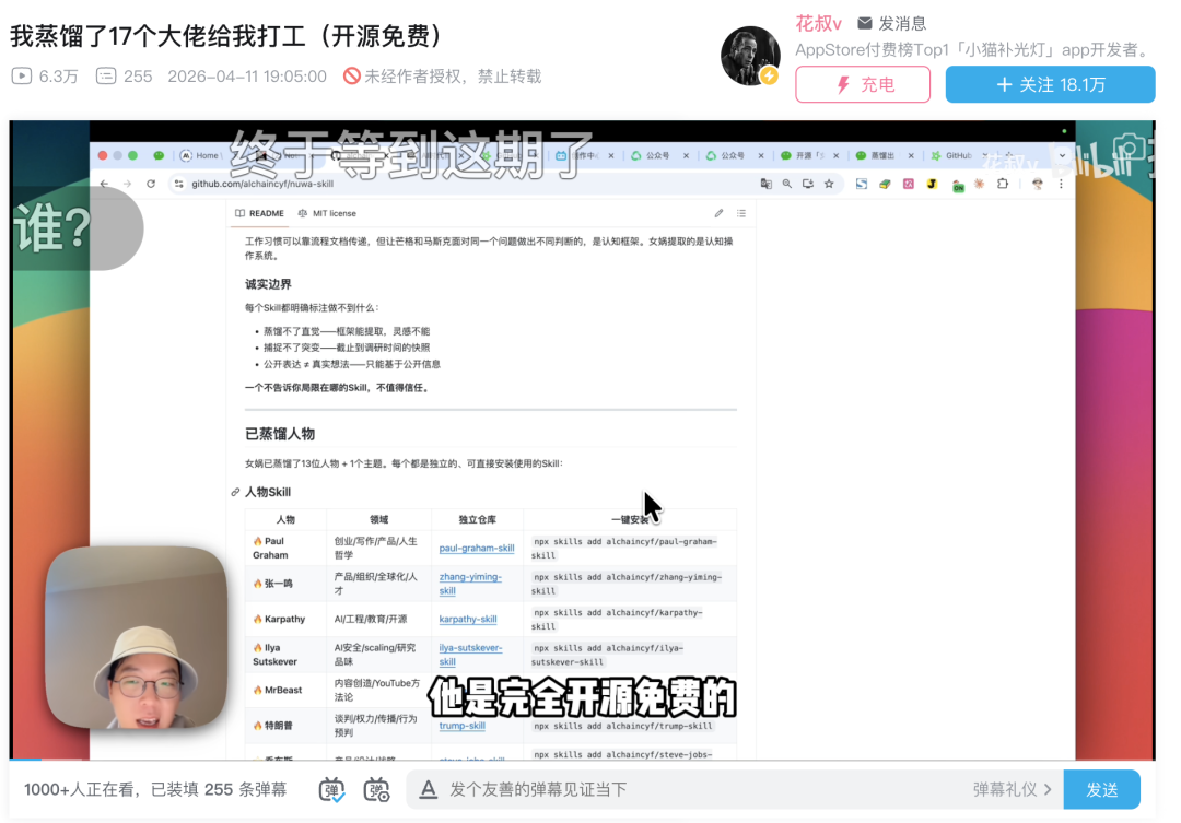 蒸馏万物成skill,B站UP花叔开源的「女娲.skill」,一周 8k star