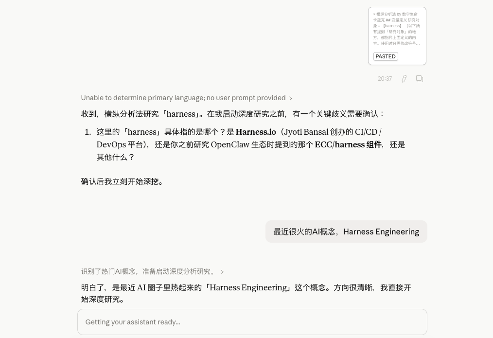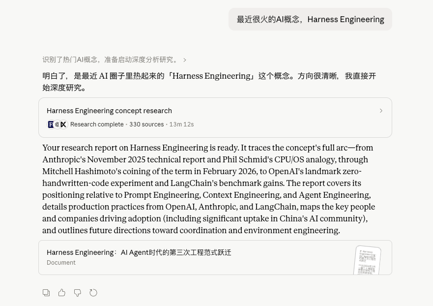 我用最近最火的Harness+Claude的深度研究来举个例子吧。