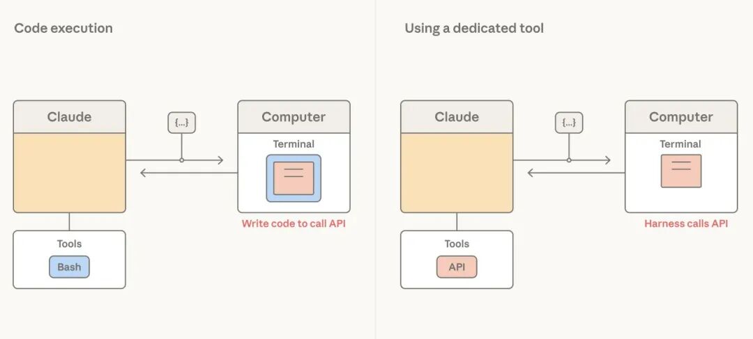 给 Claude 一个代码执行工具(如 bash 工具)可以解决这个问题:Claude 可以编写代码来表达工具调用以及它们之间的逻辑。Claude 决定哪些结果需要处理、哪些可以过滤、哪些可以直接管道传输到下一个调用,而不触及上下文窗口。只有代码执行的最终输出才会进入 Claude 的上下文。