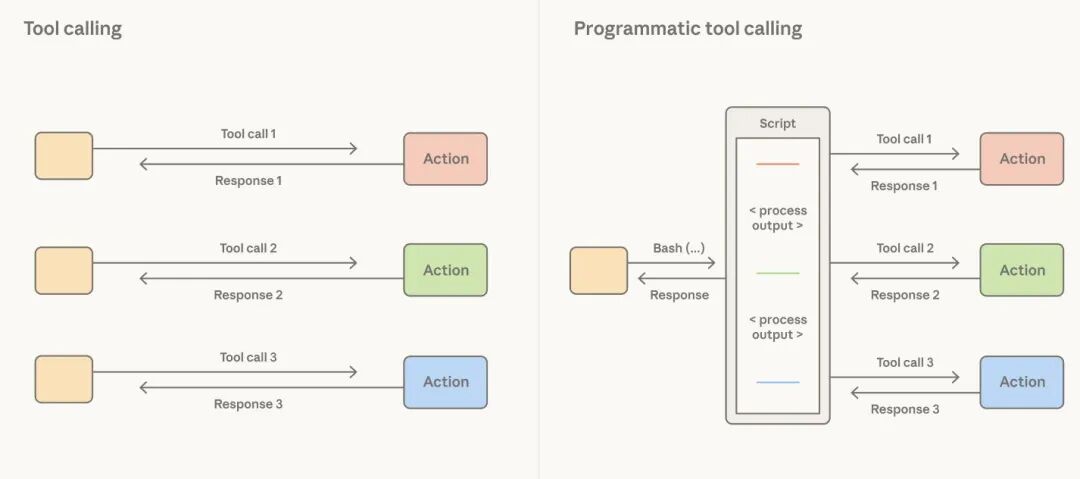 传统模式下,Claude 调用工具,每个工具结果都要经过上下文窗口处理。