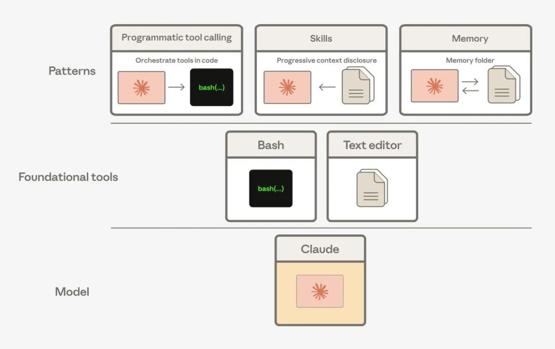 编程式工具调用、skills 和内存工具都是由 bash 和文本编辑器工具组合而成。
