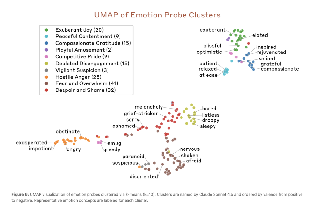 论文叫《Emotion Concepts and their Function in a Large Language Model》,研究对象是 Claude Sonnet 4.5。研究者通过让模型阅读大量合成故事,提取出了 171 个情绪概念向量。他们发现,模型内部存在一套功能性情绪表征,而且这些内部状态会因果性地驱动行为决策。