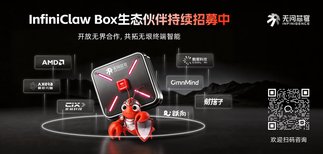 目前,InfiniClaw Box 已与爱芯元智等伙伴在端侧芯片优化与龙虾盒子等方面展开深度合作,未来还将进一步打通适配更多端侧芯片,持续探索本地龙虾在国产端侧芯片应用上的更多可能性。