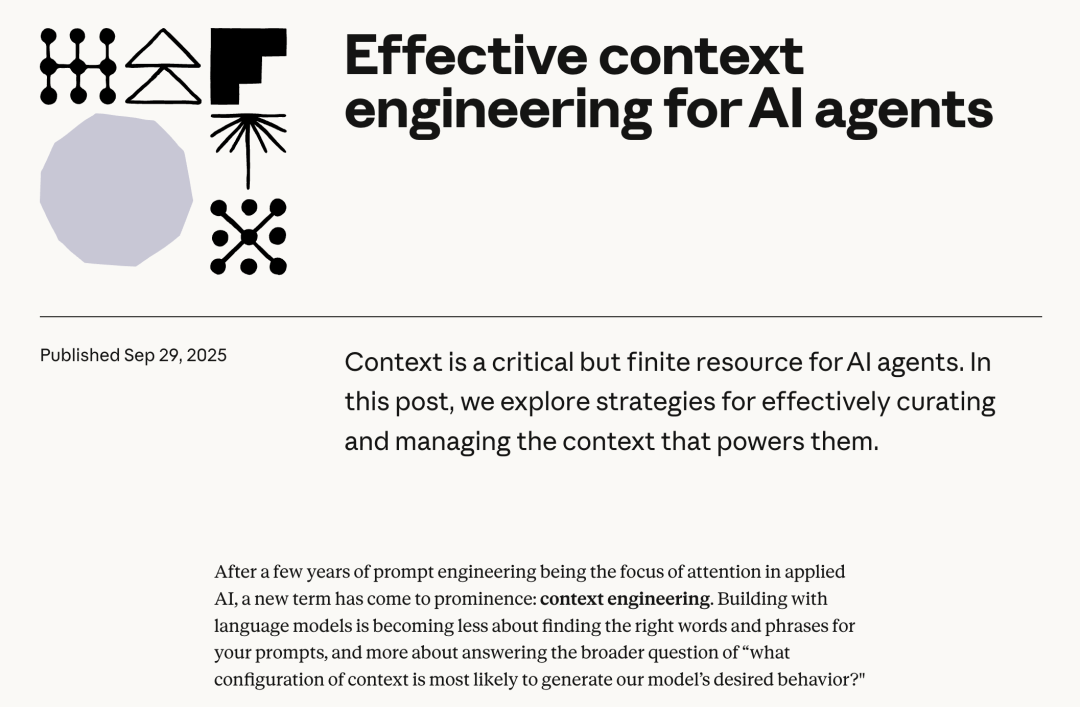 2025 年 9 月,Anthropic 发了一篇工程博客,标题叫「Effective context engineering for AI agents」。开头有一句话说得挺直接:构建 AI 应用,越来越不在于找到正确的措辞,越来越在于回答一个更大的问题:什么样的上下文配置,最可能让模型产生你想要的行为