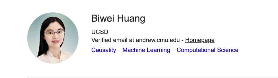 黄碧薇师从美国卡内基梅隆大学以及阿联酋 MBZUAI 的张坤教授与Clark Glymour教授,目前在UCSD(加州大学圣地亚哥分校)担任助理教授,在HDSI(Halıcıoğlu数据科学研究所)从事研究工作。