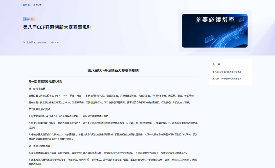 开源已成为全球技术创新与协作的主流模式。第八届CCF开源创新大赛期待你的参与,立即报名,共同为国家“人工智能+”战略贡献开源力量,推动开源创新生态繁荣发展。