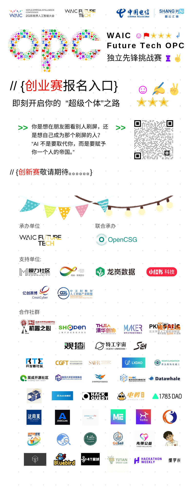 2026年的春天,距离新一届世界人工智能大会(WAIC)开幕还有三个月。首届聚焦“超级个体”创业的“OPC独立先锋挑战赛”正式开启报名。而这场赛事的联合承办方,不是什么新冒出来的流量公司,而是OpenCSG(开放传神)——一家只用三年时间,就从台下参展者,把自己做成了国内开源AI基础设施赛道最凶的一匹黑马。