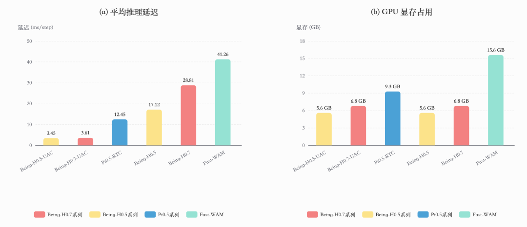在这一理念下,Being-H0.7 的部署被进一步优化至极致:其平均推理延迟低至 3.61 ms/step,推理速度相比业内以效率著称的模型(如 Fast-WAM)提升超过 10 倍,显存占用仅为同类方案的约 50%。与 Cosmos-policy、DreamZero 等视频生成式世界模型相比,其推理效率更是实现了 50 倍以上的提升。