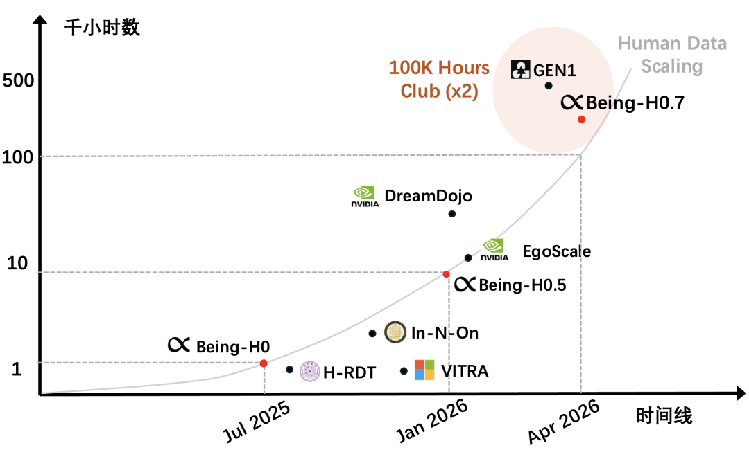 4月14日,在Generalist AI推出GEN1不到两周之时,智在无界推出的Being-H0.7进一步将这一路线推向极致——人类视频总量提升至 20 万小时,全世界仅有GEN-1达到这一规模。