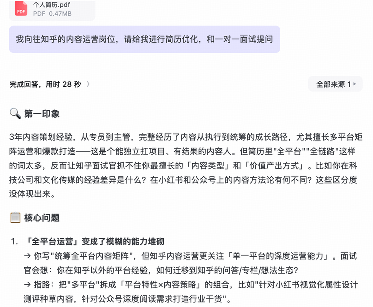 在简历诊断环节,“AI简历分析大师”模拟专业面试官视角,对用户简历进行全面拆解,识别亮点与逻辑漏洞,并结合知乎站内同行业、同岗位资深人士的真实反馈逻辑,提供针对性修改建议。用户获得的不仅是格式优化,更是基于“面试官如何审视”的专业视角。