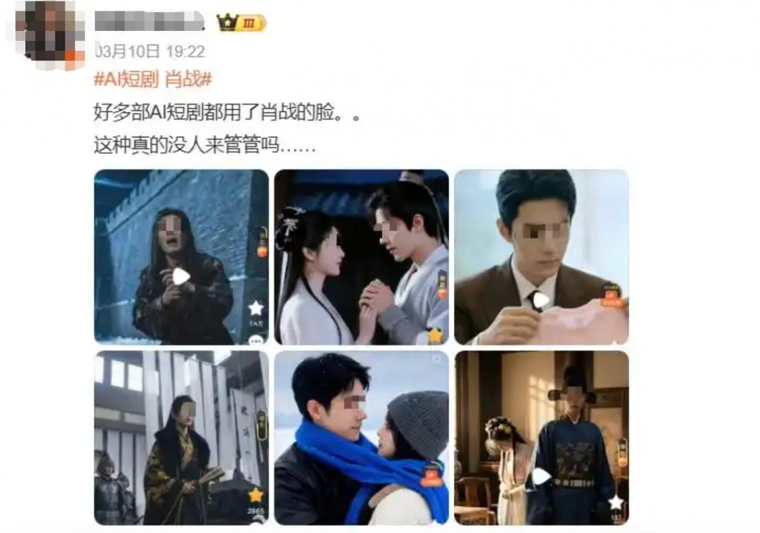 3月10日,有网友发现多部AI短剧盗用了肖战的脸。其中红果平台一部微短剧里的主角最离谱,不管是长相还是服饰,都高度撞脸肖战在《藏海传》里的造型。随后,词条“AI短剧 肖战”“AI短剧侵权肖战最高可判10年”冲上热搜。
