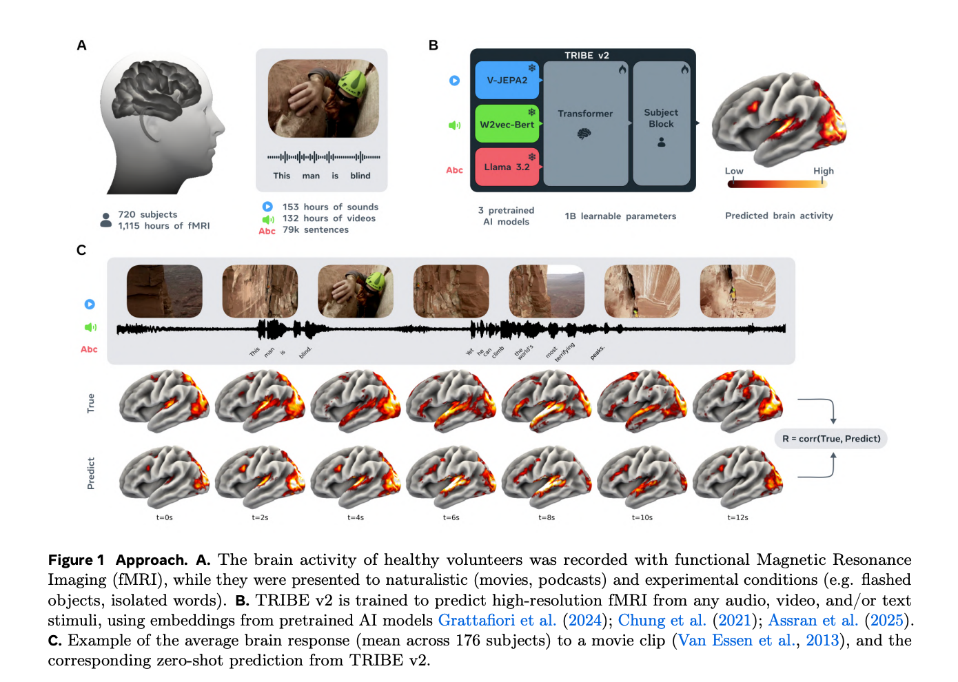 TRIBE v2 does not learn to ‘see’ or ‘hear’ from scratch. Instead, it leverages the representational alignment between deep neural networks and the primate brain. The architecture consists of three frozen foundation models serving as