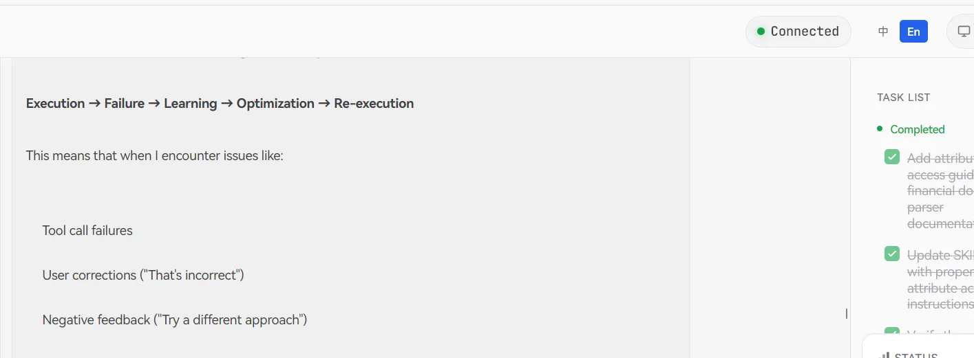 Powered by the openJiuwen Self-Evolution Framework, JiuwenClaw autonomously refines its own Skills. When a tool call fails or when the user provides negative feedback (e.g., “That’s incorrect,” or “Try a different approach”), the system proactively logs the execution error and feedback. It then performs a root cause analysis (RCA) to generate targeted optimization strategies.