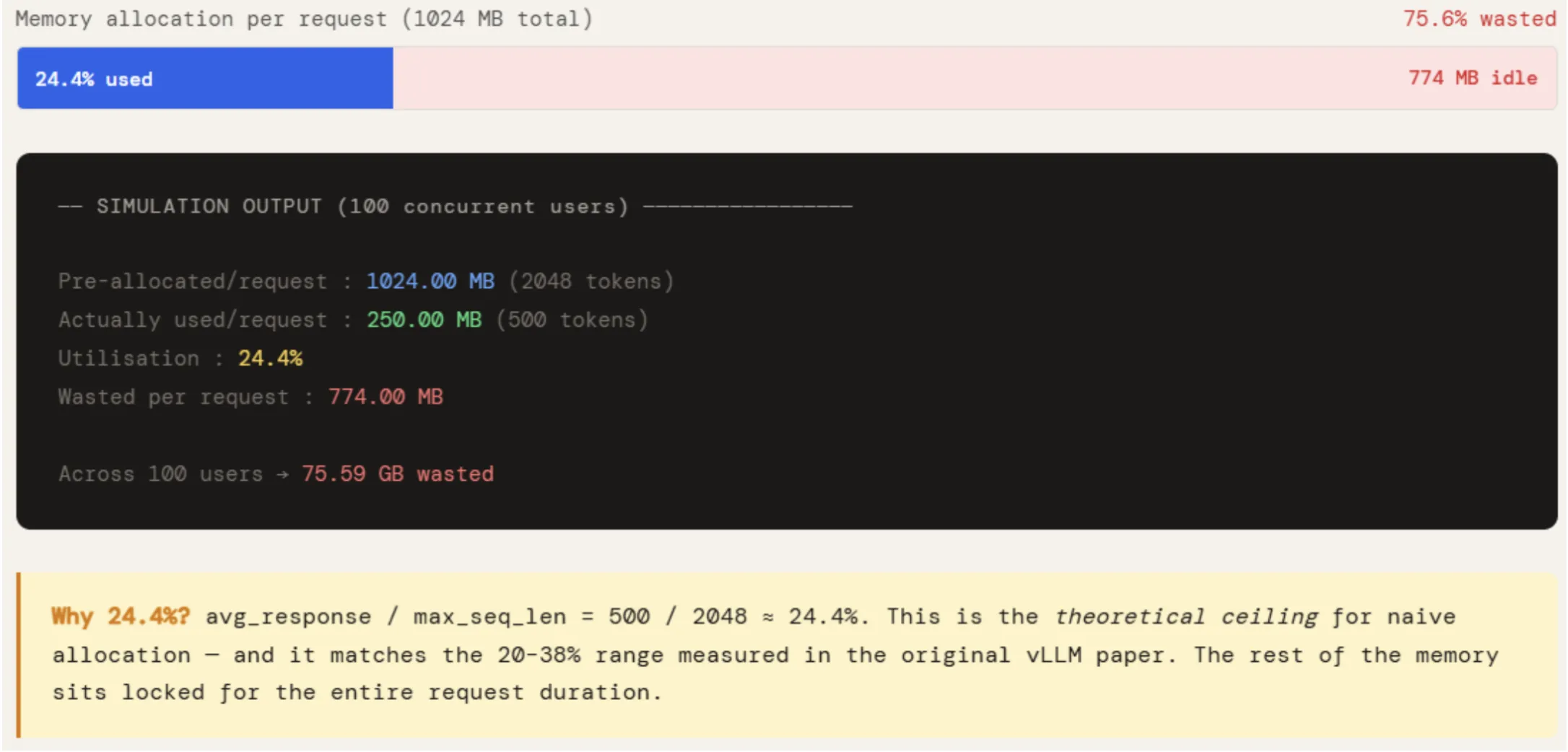 The numbers make the problem concrete. Each request pre-allocates 1024 MB but uses only 250 MB — 24.4% utilisation. The remaining 774 MB sits reserved for the entire duration of the request, unavailable to any other request. Across 100 concurrent users, that is 75 GB of GPU memory doing nothing. This is not an edge case — it is the default behavior of every system that does not implement paged allocation, and it is exactly why naive serving systems hit an OOM wall long before the GPU is computationally saturated.
